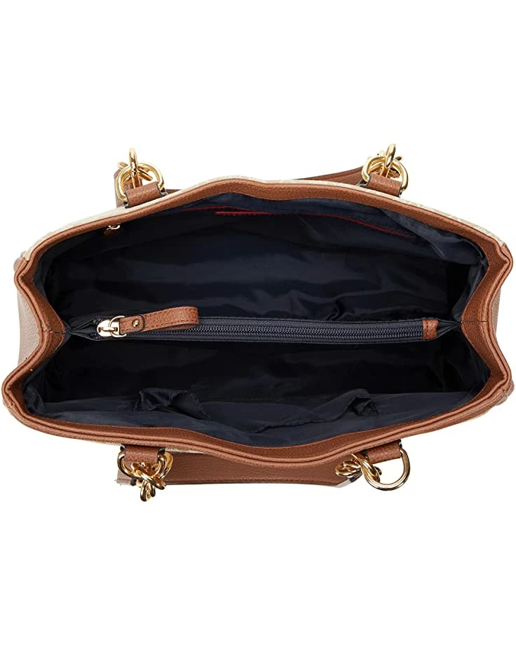 โข Exterior front slip pocket. - Dual shoulder straps with chain link detail.