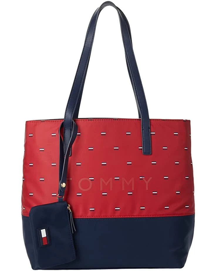 - Carry all your essentials in style with the Tommy Hilfiger® Mariana II-Tote with Hangoff-Corporate Stripe Critter Nylon. Constructed from polyester this tote features a double banded shoulder straps with dangle coin purse accessory, all over Tommy Hilfiger logo inspired pattern design, open closure, interior zip middle compartment, interior slip compartments on each side, and a flat base for added support.