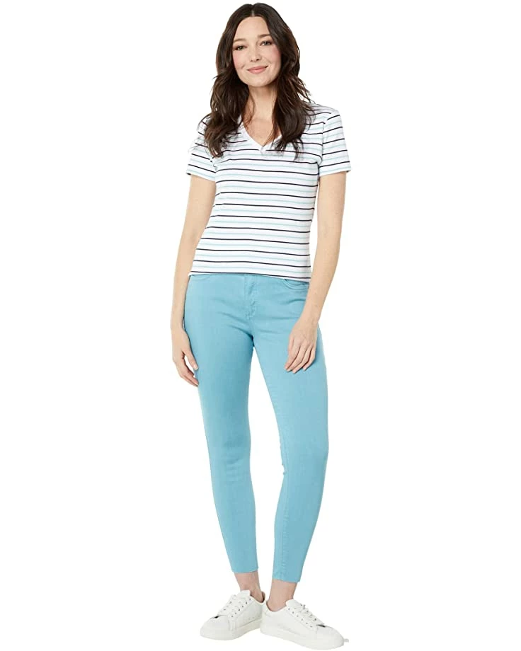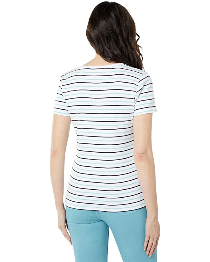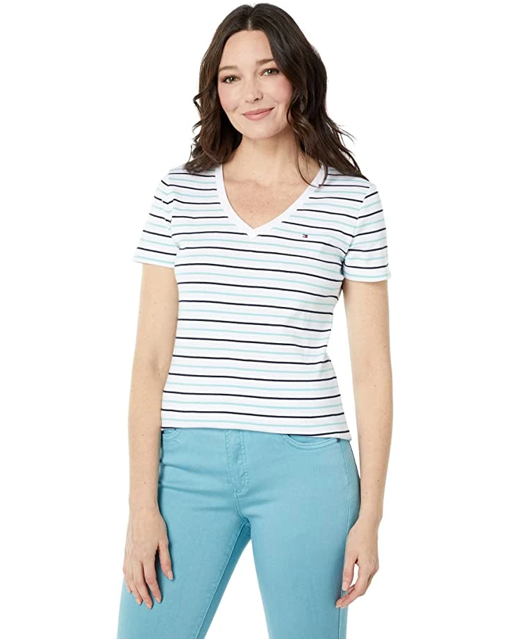 - Your casual look is sure to be enhanced wearing the Tommy Hilfigerยฎ Short Sleeve Stripe V-Neck Tee.