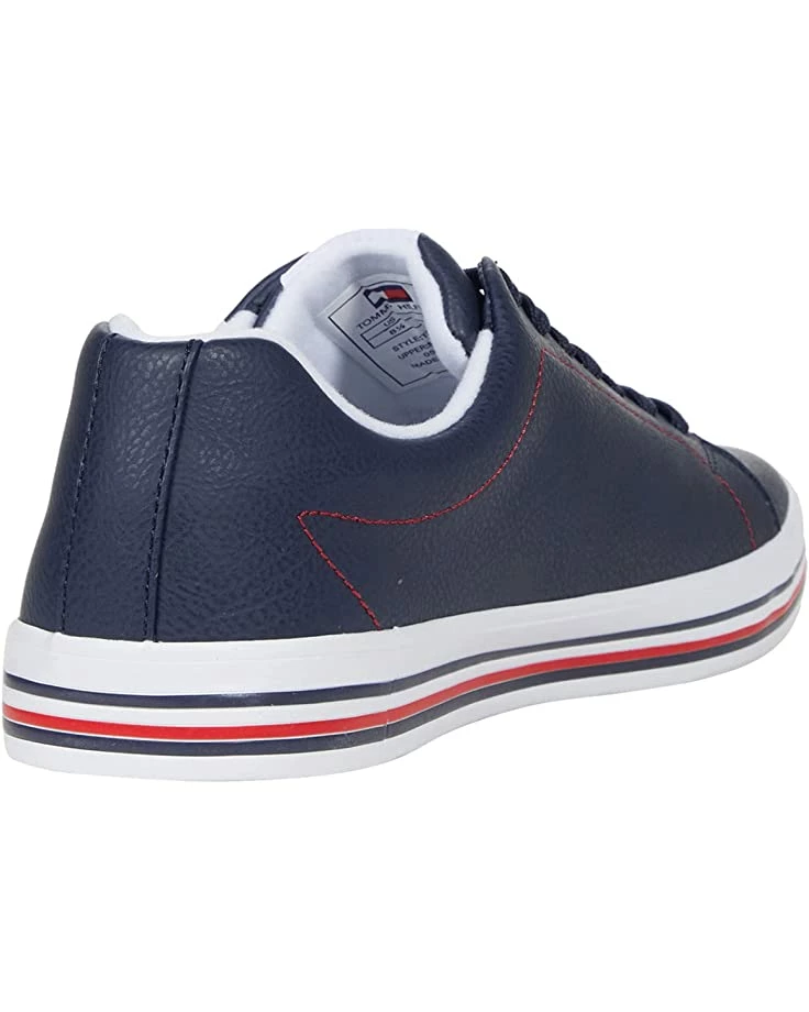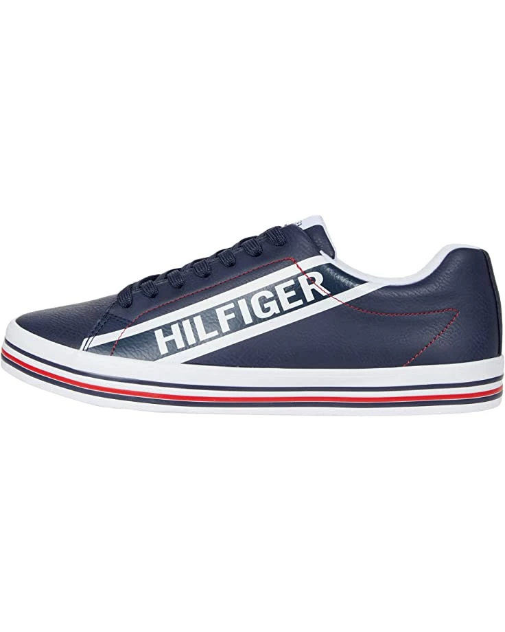 - Make a statement with the Tommy Hilfiger® Risko! This casual faux leather sneaker features a rounded toe, large side logo, and striped midsole.