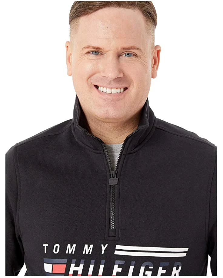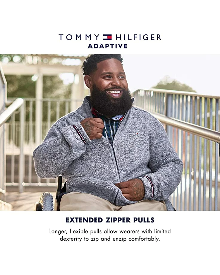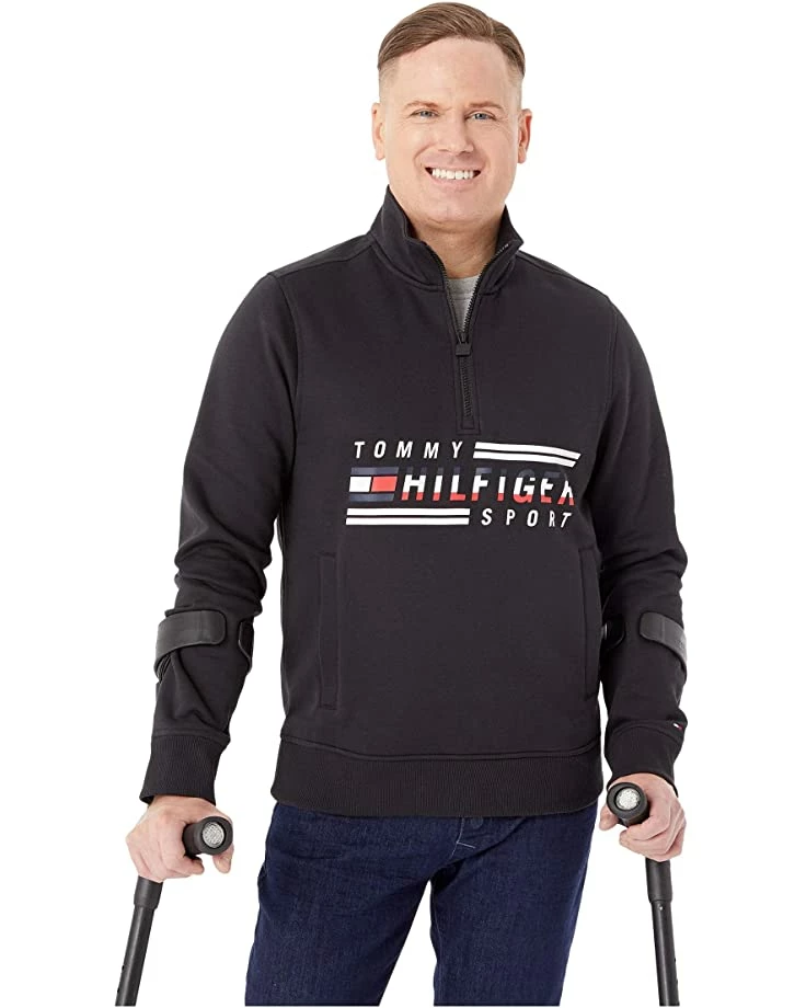 - Tommy Hilfigerยฎ men’s sweatshirt. A fresh jacket alternative for those transitional months of the season-our mockneck sweatshirt in a soft cotton knit. Dressing is made uncomplicated thanks to a half-zip closure at the center front that conveniently expands the neck opening. Part of the Adaptive Collection, designed for ease of dressing in classic Tommy style.