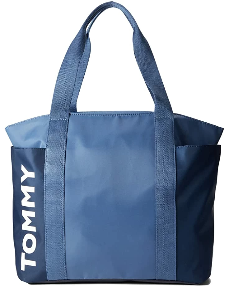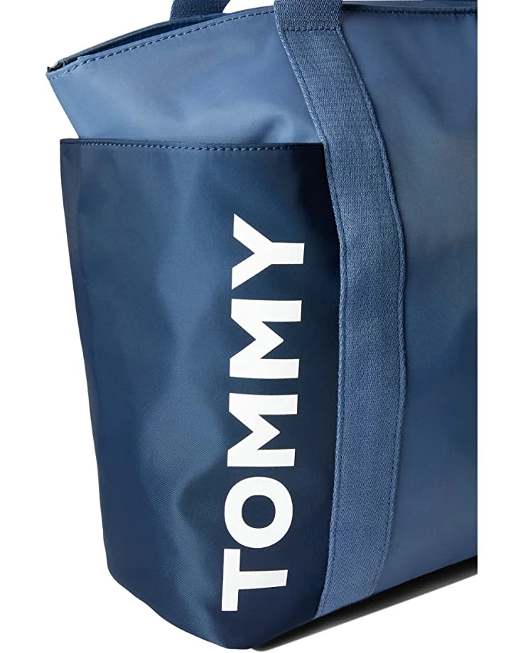 - Carry all your essentials inside the Tommy Hilfiger® Nikki II Overnight Tote-Bold Logo Color-Block Nylon Bag.