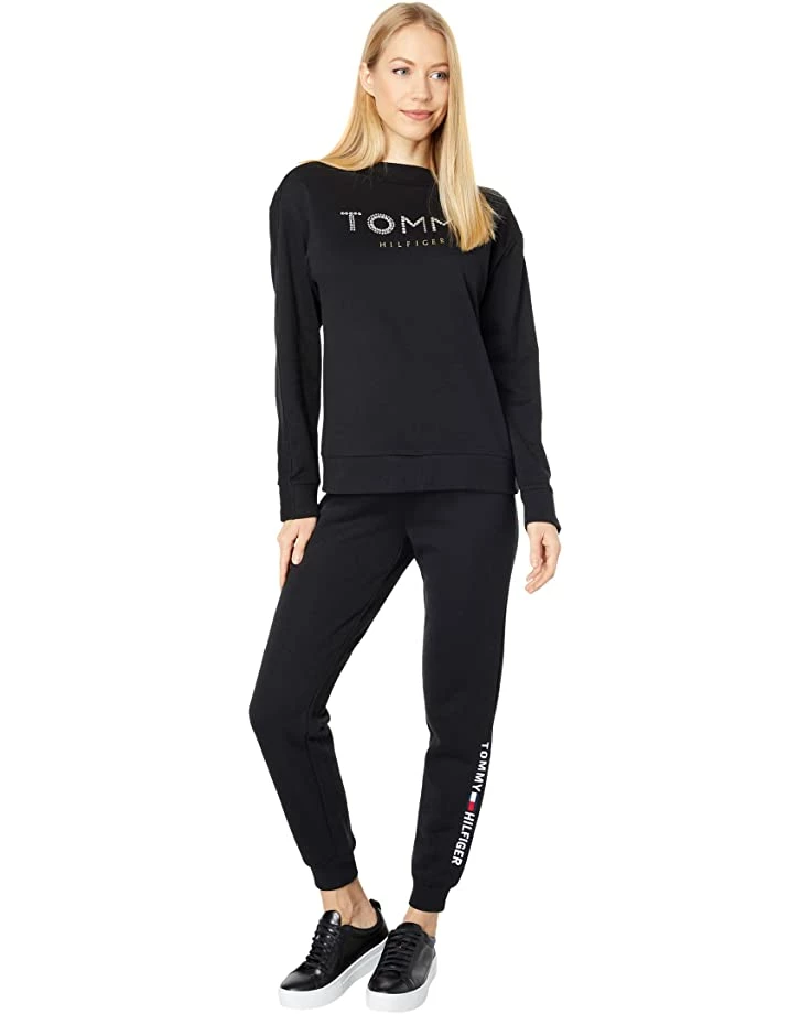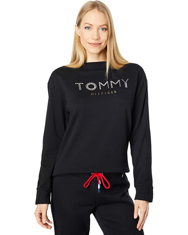 - Crafted for an all day style and comfort, the Tommy Hilfigerยฎ Embellished Boatneck Sweater features a crew neckline, long sleeves with fitted cuffs, center chest front bedazzled Tommy Hilfiger logo design, and a straight hemline.