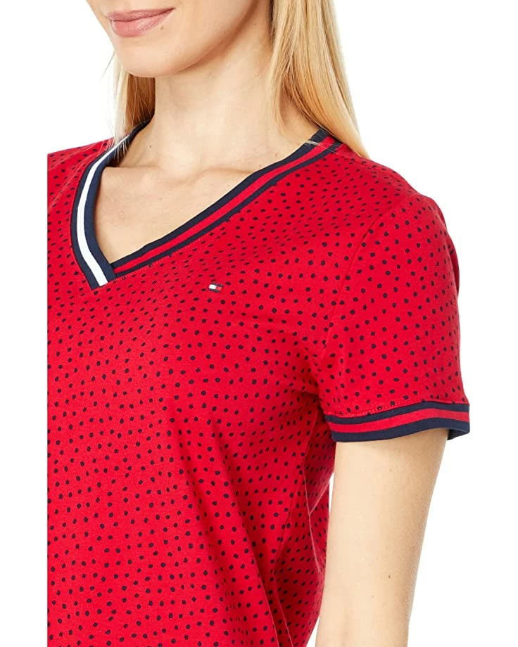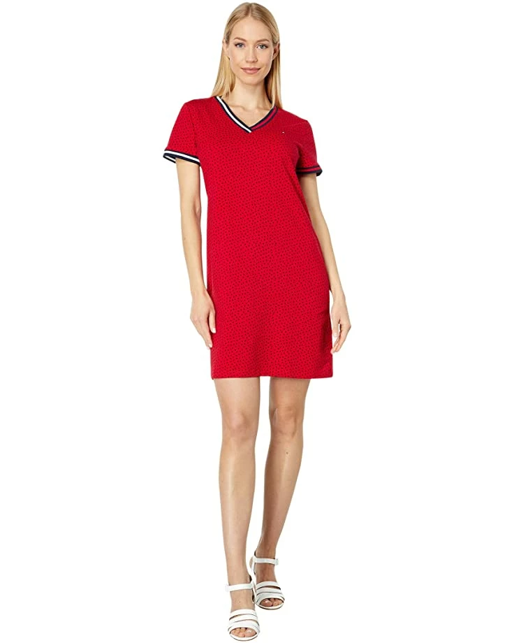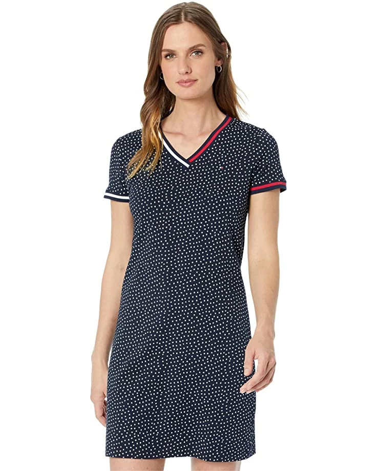 - The Tommy Hilfiger® Short Sleeve V-Neck Tee Dress Dot Print is feminine, cute, comfy, and effortlessly chic.