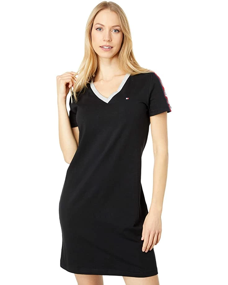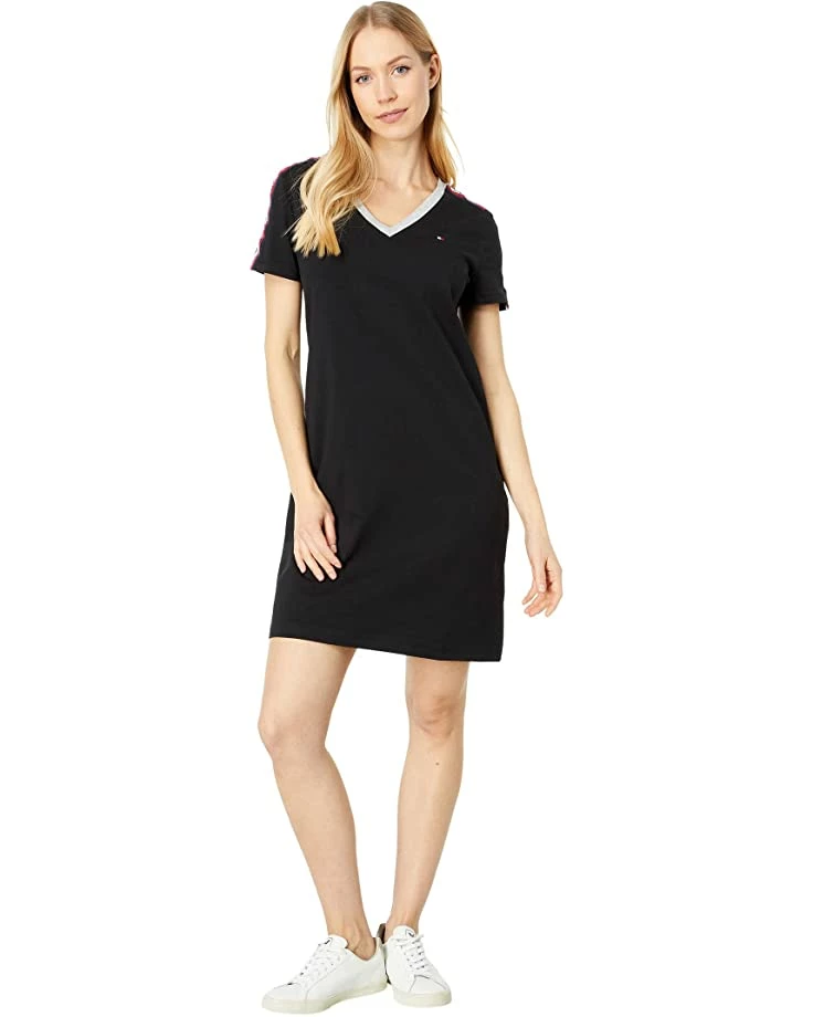 - Add to your warm weather wardrobe with the Tommy Hilfiger® Solid V-Neck Dress. This stretch cotton-blend jersey dress is crafted with a contrast V-neckline, short sleeves with signature logo flag stripes and a straight hemline that hits above the knee for a clean finish to your basic preppy look.