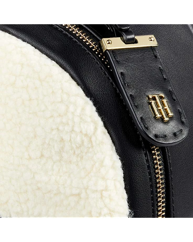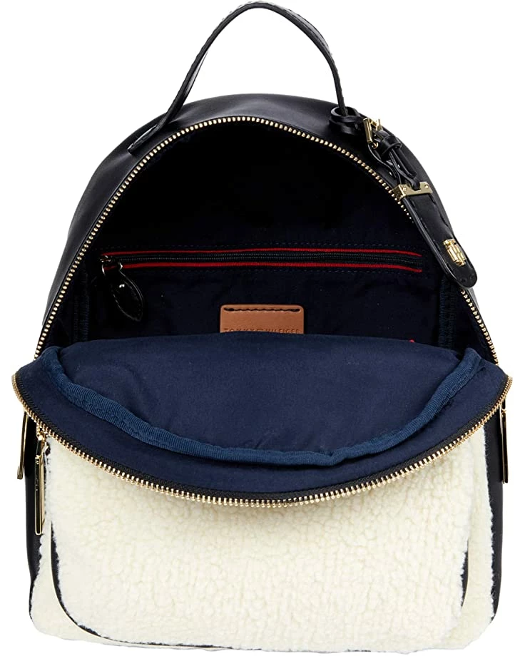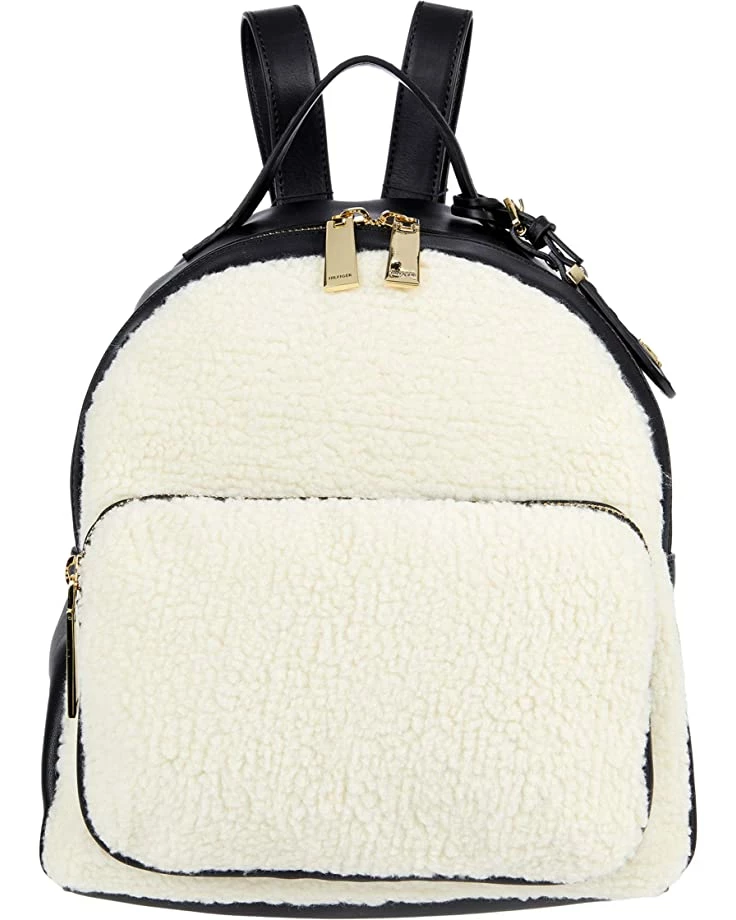 - Tommy Hilfigerยฎ Julia Dome Backpack – Shearling PVC features a leather and shearling backpack with full zip-closure and front zippered pouch pocket and adjustable arm straps. Perfect for all the essentials!