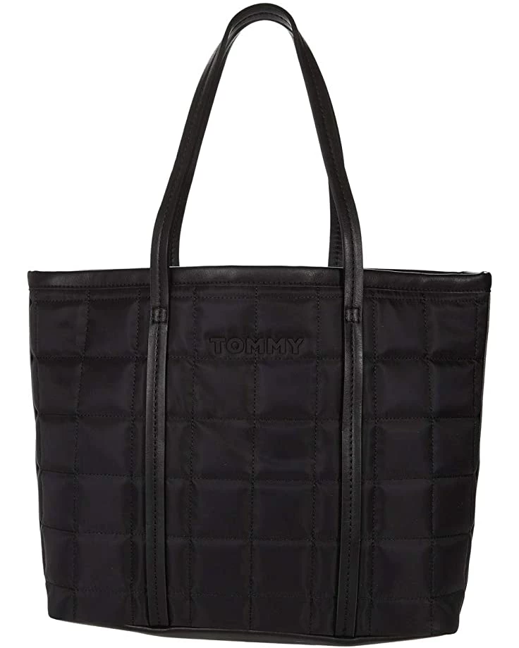 - Keep your essentials organized in style with the sleek and roomy Tommy Hilfigerยฎ Robin Tote Quilt Nylon, with a magnetic button snap closure, dual shoulder straps, and plenty of room for your essentials.