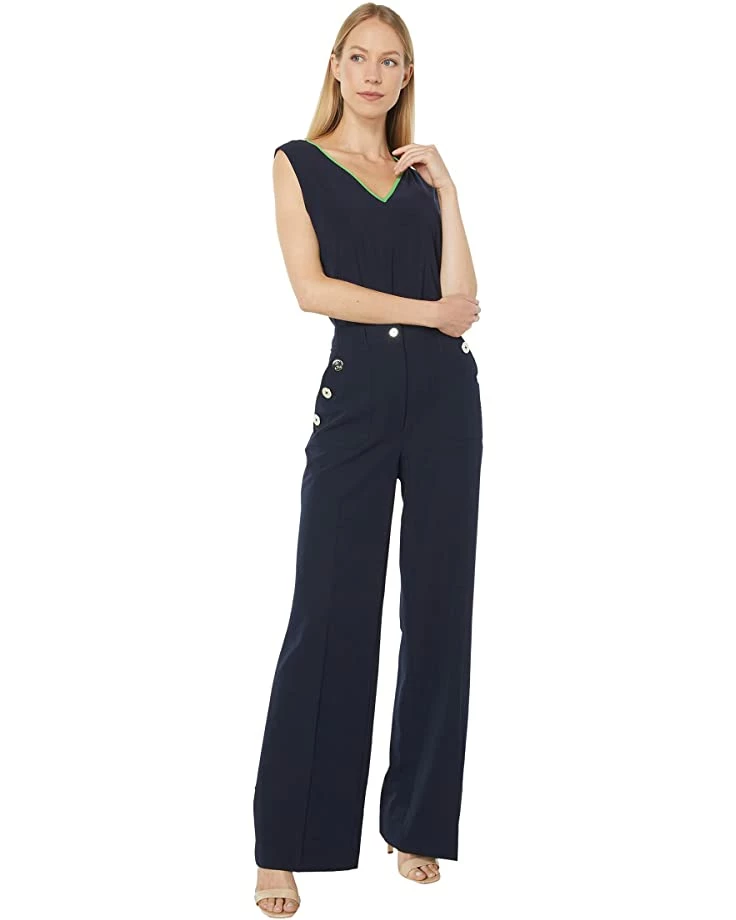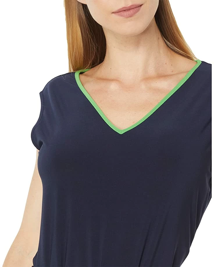 - Pullover V-neck tank top with contrast piping at neck and straight hem.
