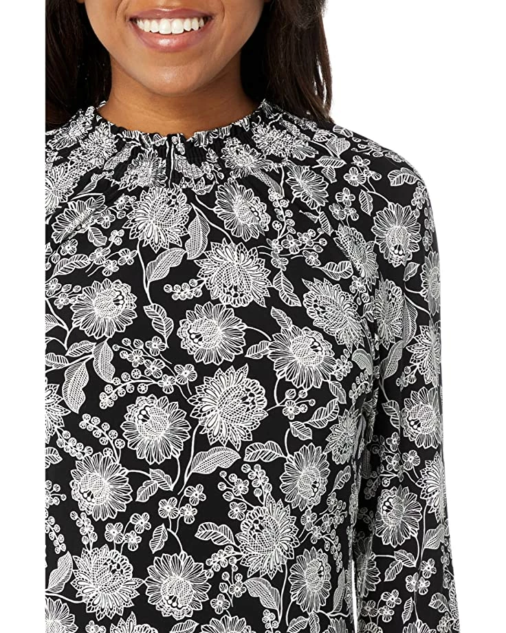 - Smocked high neck and long sleeves.