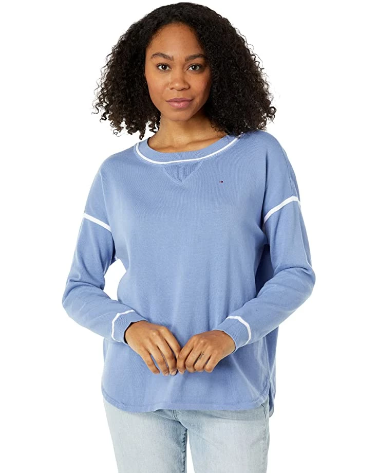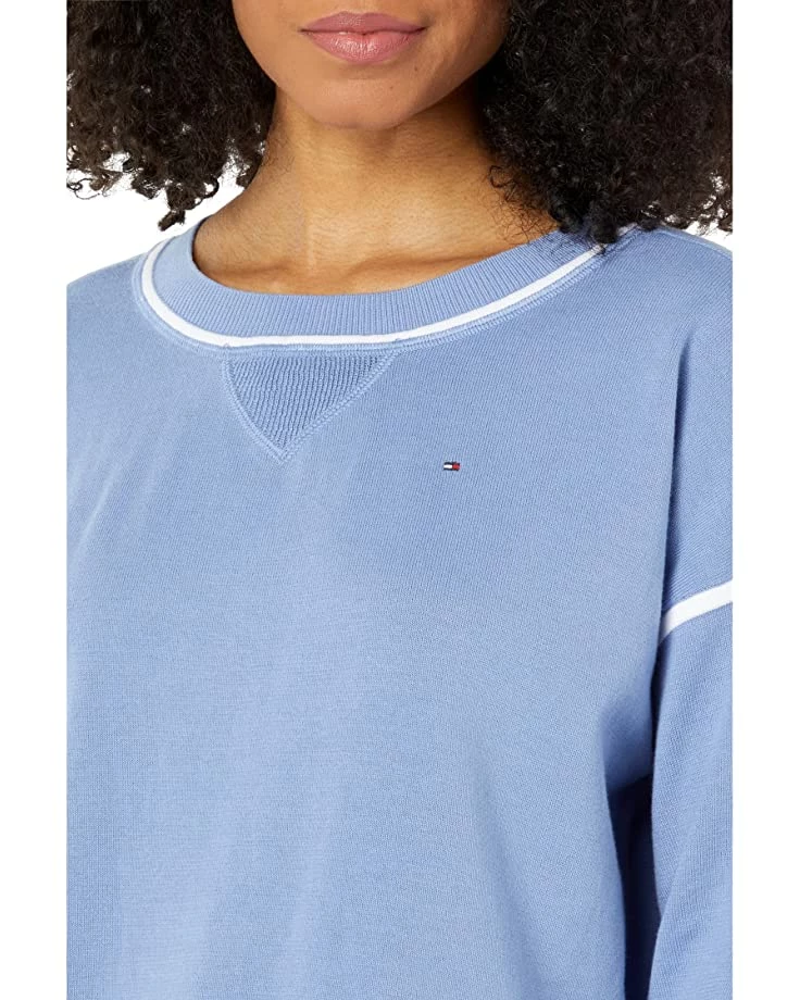 - The Tommy Hilfiger® Tipped Round Hem Sweater keeps you cozy with its relaxed design in a cotton fabrication.