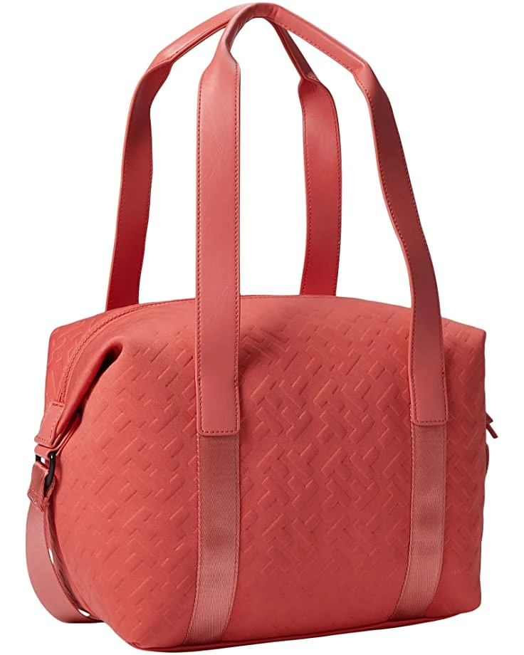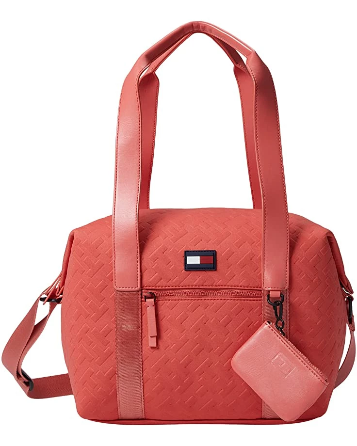 - Take all gym essentials with you in Tommy Hilfiger® Drew II – Convertible Duffel with Pouch – TH Bias Debossed Neoprene handbag.
