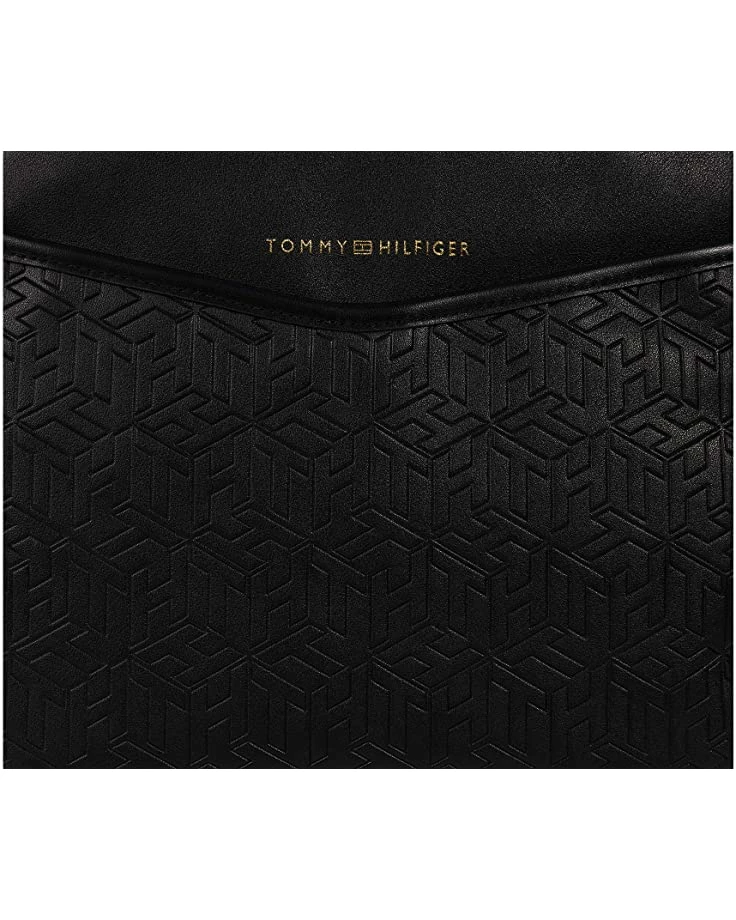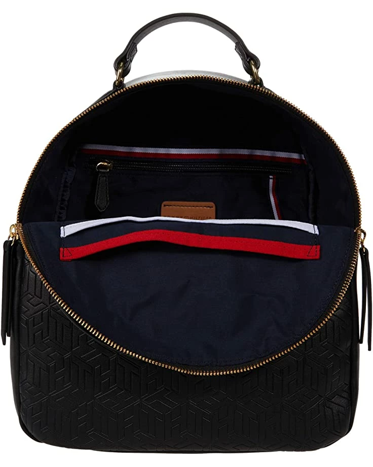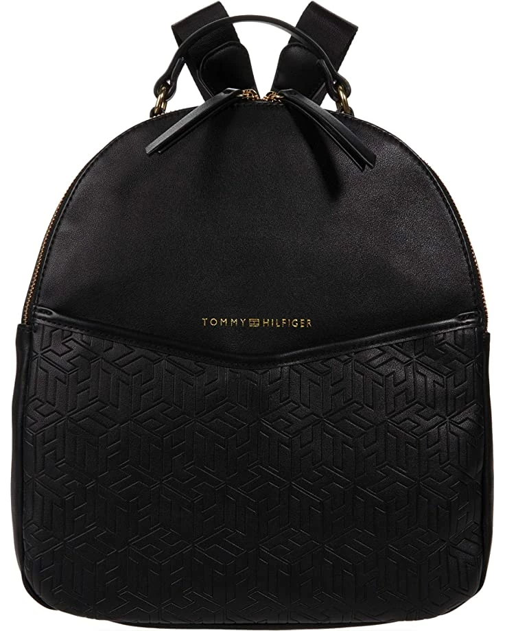 - Keep all your essentials close in the Tommy Hilfigerยฎ April Backpack – TH Cube Embossed PVC featuring a classic zip-closure backpack with adjustable arm straps and inside zip-closure pocket boasting top handle and textile detailing on front side.
