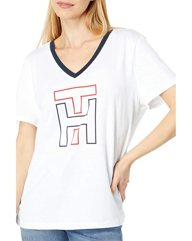 - Get ready for a game night or movie outing wearing the comfy and stylish Tommy Hilfiger® Interlocking Logo V-Neck Tee.